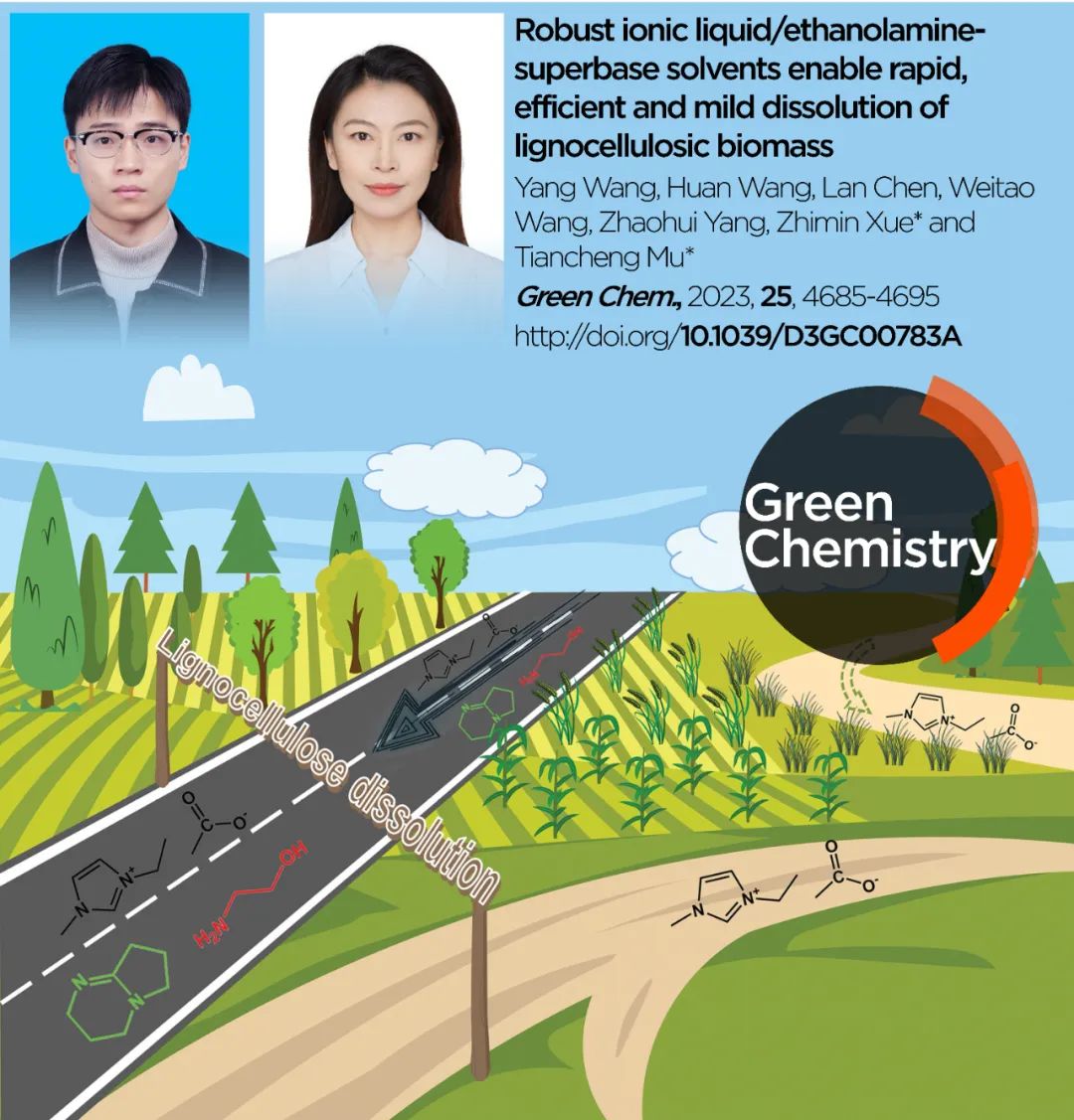 该成果以“Robust ionic liquid/ethanolamine-superbase solvents enable rapid, efficient and mild dissolution of lignocellulosic biomass”(《离子液体/乙醇胺-超碱溶剂快速、高效、温和溶解木质纤维素生物质》)为题,发表在英国皇家学会期刊 Green Chemistry 上,并入选为期刊内封面文章。
