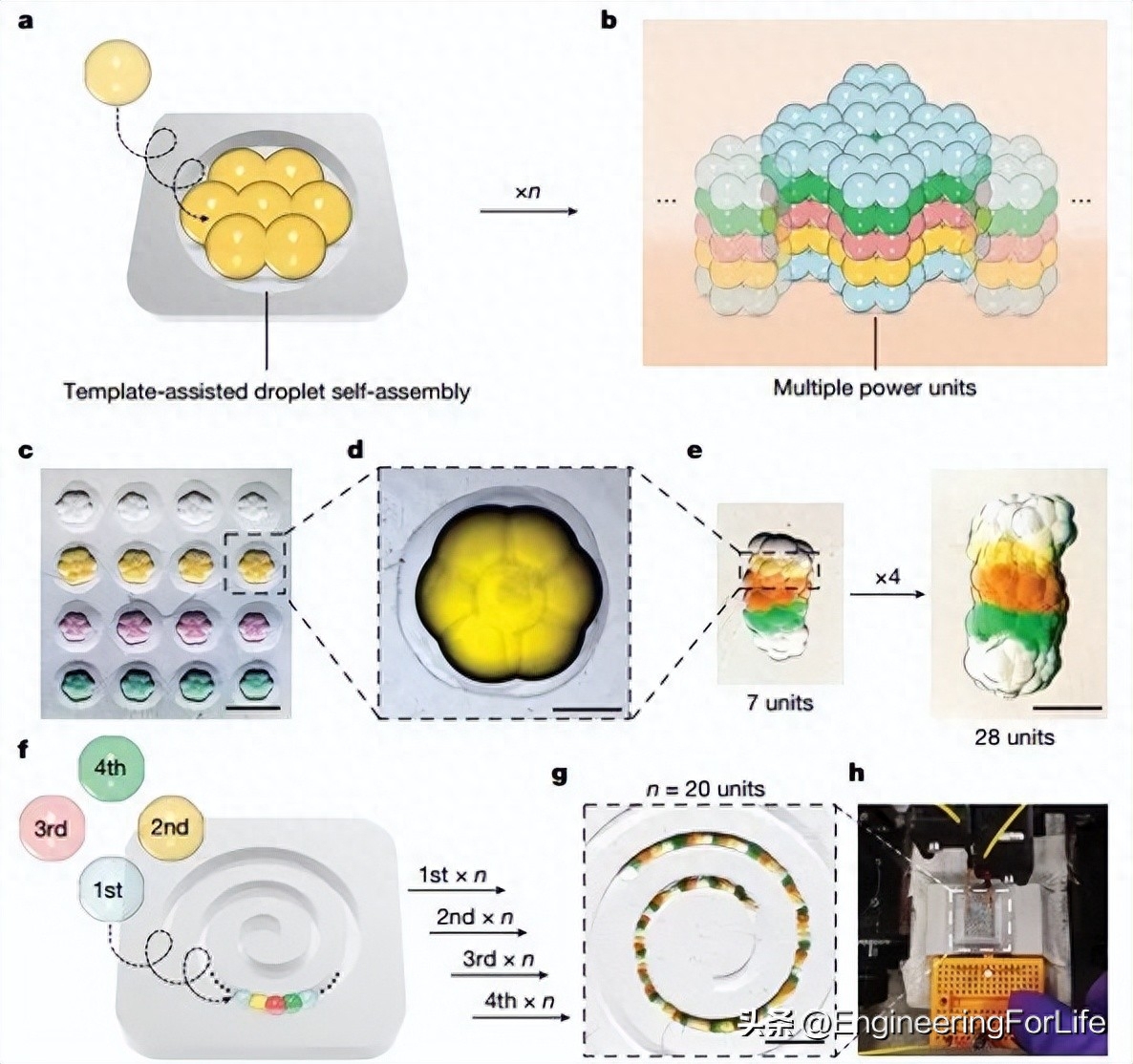 ①通过沉积以脂质为支撑的纳米液滴水凝胶网络,基于其内部的离子梯度产生能量的原理开发出一种微型软电源;