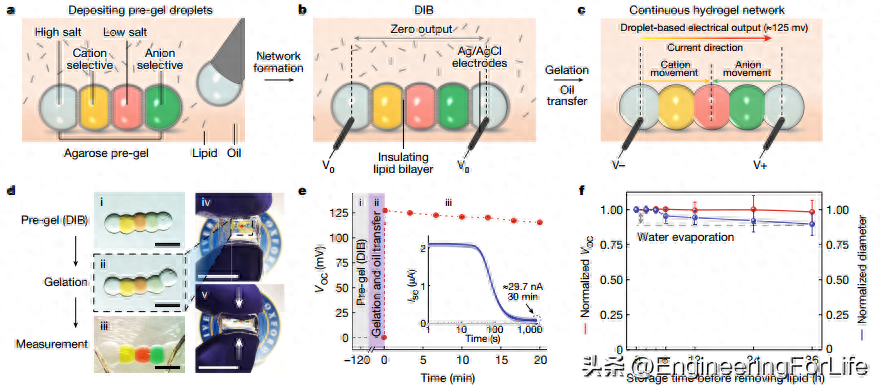 电鳗(Electrophorus electricus)的发电能力依赖于成千上万个电细胞的串联堆叠,其中阳离子 Na+ 和 K+ 可在浓度梯度的驱动下通过细胞膜上的离子选择性蛋白通道单向传输。本研究模仿了鳗鱼电器官的总体布局和机制,将五个纳升级预凝胶(琼脂糖)液滴依次组合在一起(图 1)。在一个单元中,液滴的顺序是:高盐(例如 CaCl2、KCl 或 NaCl)、选择性阳离子、低盐、选择性阴离子和另一个高盐液滴。它们通过电子微注射器沉积在含脂油中。液滴最初被单层脂质包围,在相互接触后几秒钟内形成液滴界面双层(DIB),从而形成稳定的无支撑结构。为了激活电力源,本研究将组装好的液滴移入无脂油中以去除脂质并分解 DIB。然后将液滴在 4℃下凝胶化,形成连续的水凝胶结构。