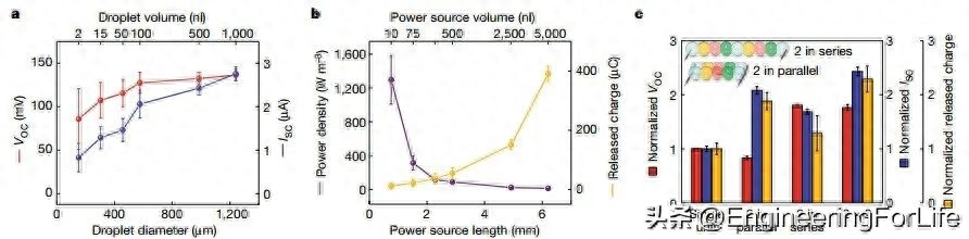 使用脂质支持的水凝胶液滴制造软电源的优势之一是易于微型化。将液滴的体积从 1,000 nl减小到 1.84 nl,减少了 99.8%,结果导致输出电压(36%,从 136 MV减小到 87 MV)和电流(70%,从 2.7 μA减小到 0.83 μA;图 2)同时下降。这些下降可能是由于液滴内阻的增加以及选择性液滴上浓度极化的增加。事实上,1.84 nl 液滴在电阻匹配处的平均能量密度大大增加了约 100 倍,达到约 1,300 W m-3,与之前的鳗鱼启发设计相比增加了约 680 倍,与随后的纸凝胶设计相比增加了约 5 倍。虽然小型化电源释放的总电荷量较低,但可以将多个电源单元串联和/或并联,以增加输出电压和/或电流。VOC 随串联单元数量的增加而增加;ISC 和总释放电荷随并联单元数量的增加而增加(图 2c)。