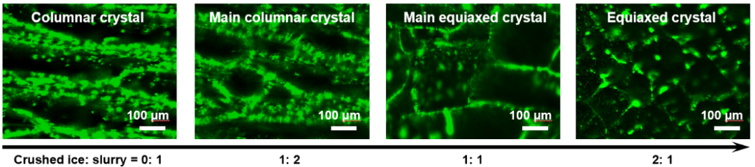 图3. 不同碎冰比例下使用光学荧光显微镜对碎冰冷冻进行原位观察