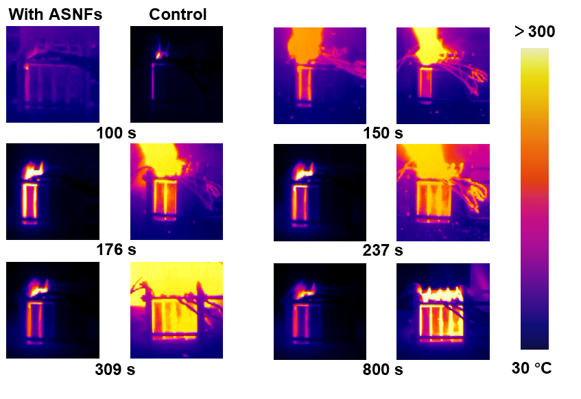 图5. 陶瓷纳米纤维气凝胶对热失控的阻断红外图像