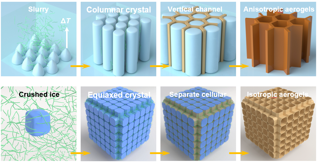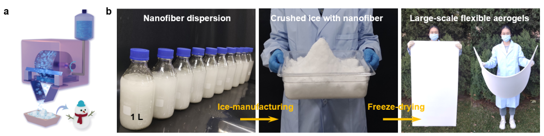 图1. 碎冰模板法大规模制造气凝胶的示意图