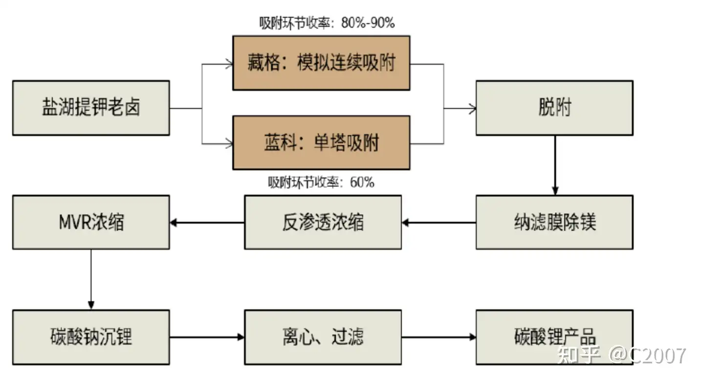 目前藏格锂业和盐湖股份下属的蓝科锂业提锂区位分别在察尔汗盐湖的两侧,两者使用的工艺为吸附+膜法,前端工序为吸附,后段工序为膜法。