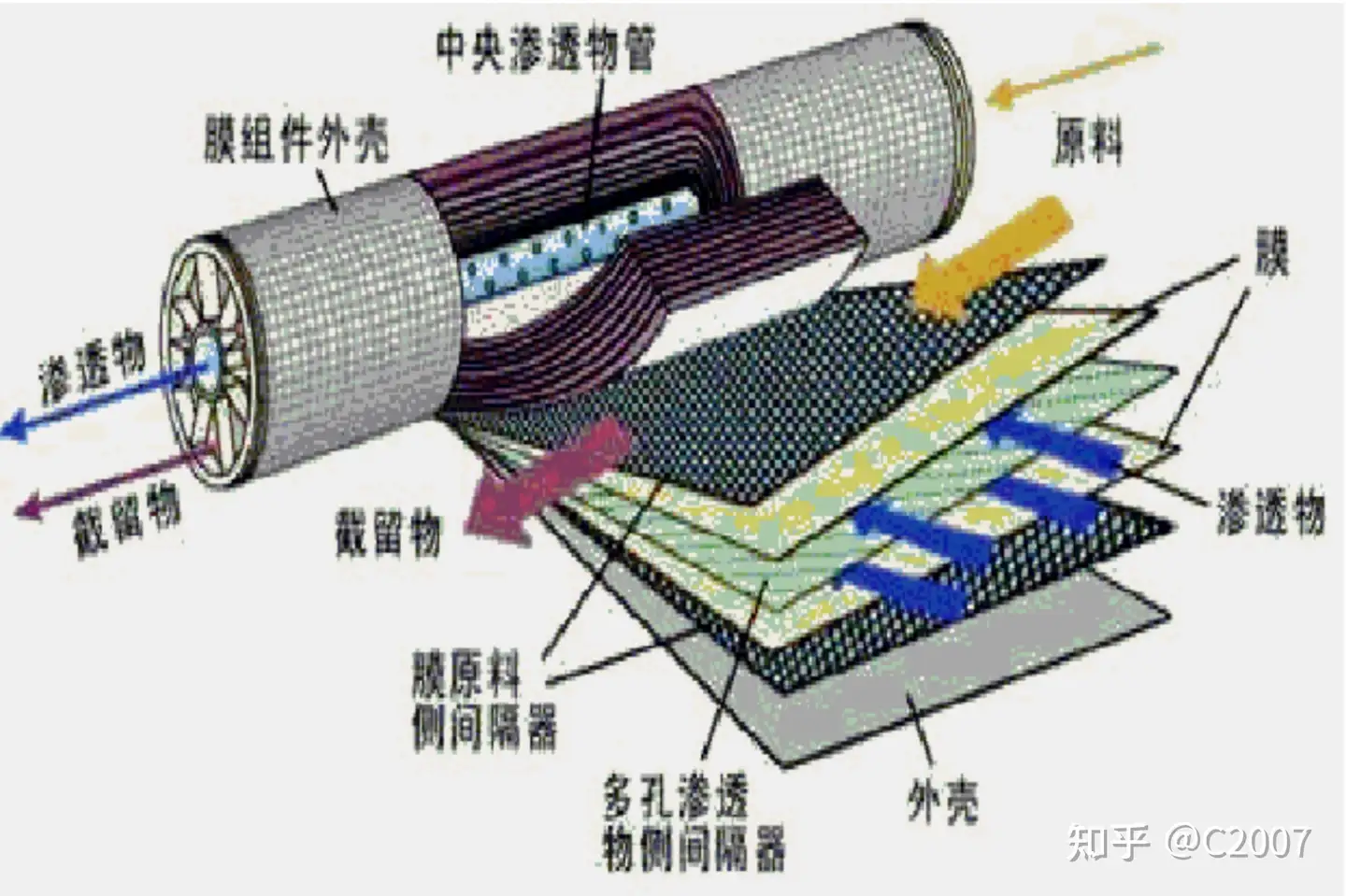 其原理为:对膜的一侧卤水施加压力,水分子被倒压通过膜,溶质粒子保留,反渗透法通常为上文中纳滤膜法和电渗析法的补充。