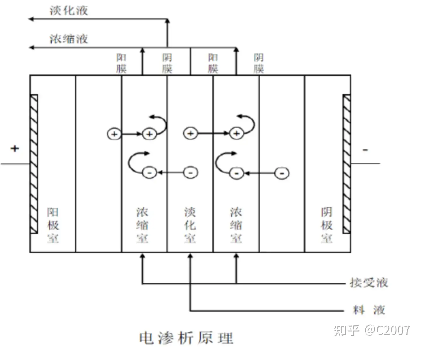 其原理为:通过电场力的作用使卤水中的阳离子迁移,其中锂等一价阳离子透过选择性离子交换膜迁移到浓缩室,而镁、钙等二价阳离子被膜阻隔,留在脱盐室。