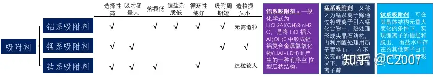 以青海察尔汗盐湖为代表,常用的方法是离子交换吸附法,利用锂吸附剂吸附锂离子,然后用高纯水将锂离子洗脱,从而降低盐湖中的镁锂比,吸附效果可以通过吸附剂内部的孔道结构设计实现,也可以在吸附剂上添加官能团,通过官能团抓取锂离子实现。锂离子吸附剂是关键材料,分为锰系、钛系离子筛和铝系吸附剂,其中铝系吸附剂是目前我国青海盐湖唯一大规模工业化应用的吸附剂。