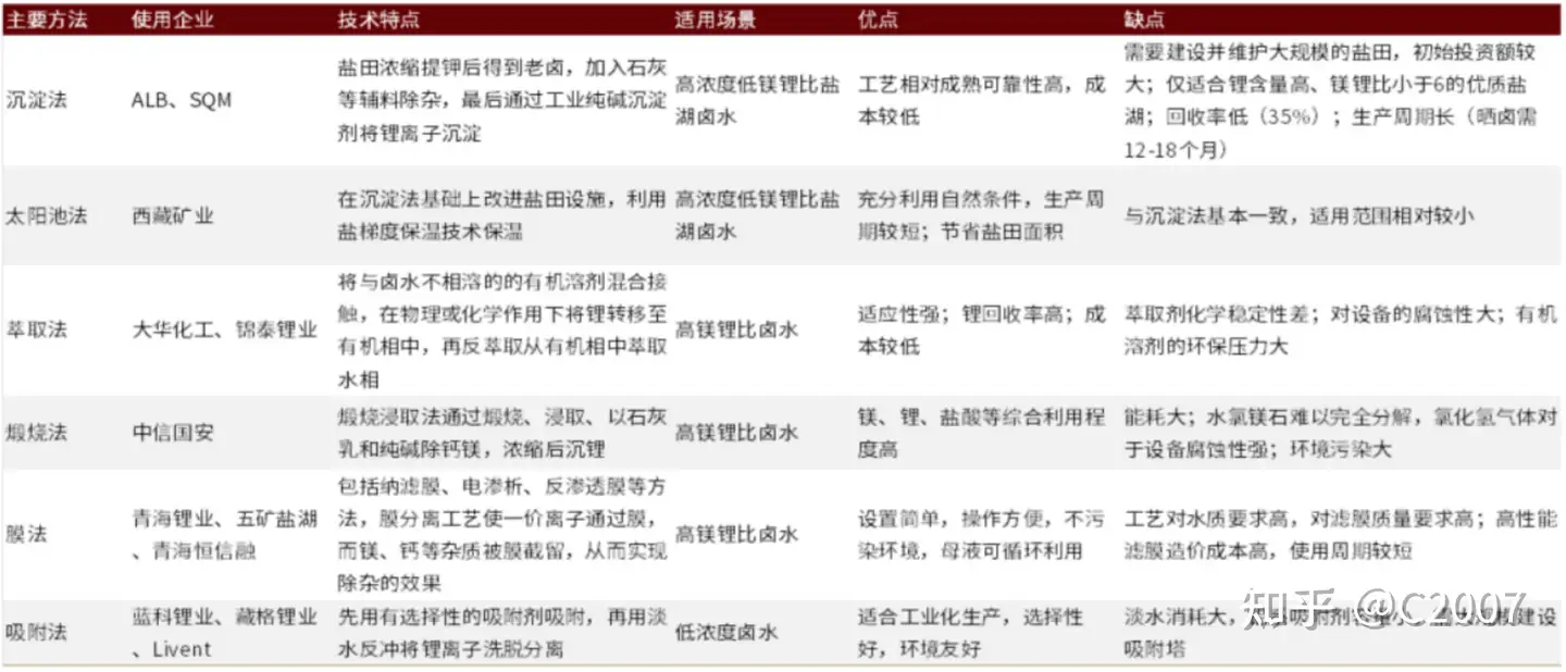 根据中金公司的整理,高镁锂比卤水提锂一般使用萃取法、煅烧发和膜法,高浓度低镁比盐湖提锂一般使用沉淀法和太阳池法,可以看出,盐湖提锂呈现出“一湖一策”(根据所提锂盐湖的自然禀赋)的工艺特点。