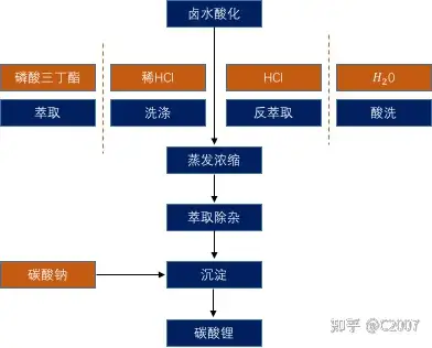 代表为青海大柴旦盐湖,代表公司为大华化工和锦泰锂业,萃取法大体分为两步骤,分别是萃取和反萃取,卤水经过酸化,加入有机溶剂进行萃取,再加入盐酸等反萃取。由于需要加酸和有机溶剂等具有腐蚀性的物质,因此在萃取过程中会对设备造成损害。