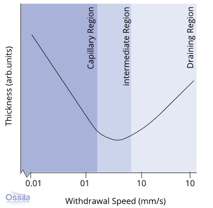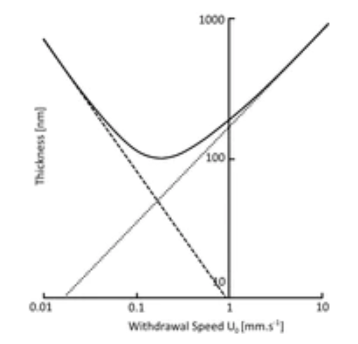每个区域之间转变的发生与提拉速度和溶液粘度有关。三个区域综合起来,最终决定出“薄膜厚度和提拉速度”的关系。若将排水流区域和毛细流区域的贡献结合起来,有可能得到一个方程,通过它能解释厚度和提拉速度(较宽尺度变化时)的关系。该方程还能告诉我们某种溶液可沉积的最小薄膜厚度。