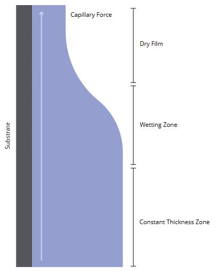 浸涂液膜中有四个明显的区域。它们分别是静态弯液面,动态弯液面,恒定厚度区域和浸润区域。