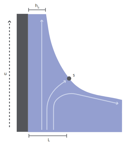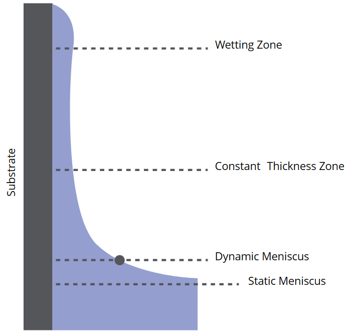 下图展示的是动态弯液面区域。静态和动态弯液面的转变发生在边界层L内部。该区域中,粘滞流产生的力会影响溶液的运动方向。越过边界层,排水力就显著超过粘滞力,而在该区域中,静水压力和毛细压力的平衡决定弯液面的形貌。