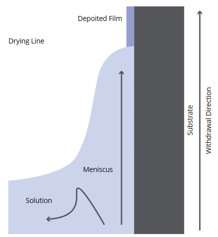 上图展示的是浸涂过程,基底退出溶液,液膜在基底上形成。首先,将基底下降,完全浸没入溶液中。在溶液中停滞一段,随后再开始提拉。在提拉过程中,一层薄薄的溶液依旧留在基底表面。带基底完全提拉出溶液,液膜中的溶液开始挥发,在基底上留下干燥的薄膜。对于特定的材料,可对薄膜进行固化步骤,这样能使沉积的材料发生相应的化学或者物理变化。