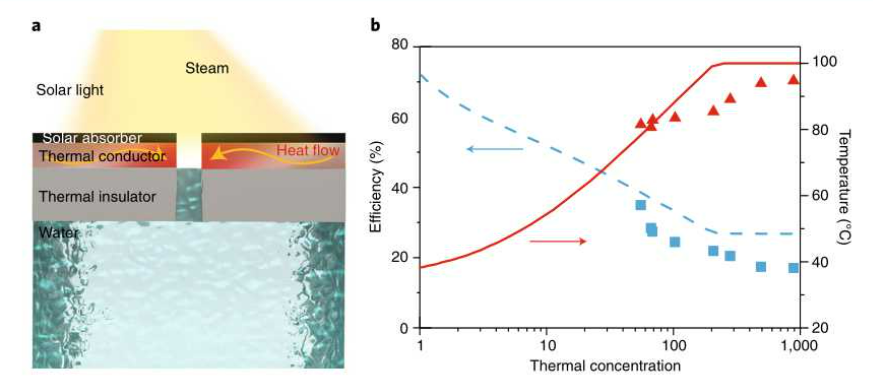 图6 |热浓度下的太阳能驱动界面蒸发。a,在环境压力下通过热浓度在100°C下产生蒸汽的示意图。b,蒸发效率和蒸汽温度对热浓度的依赖性。