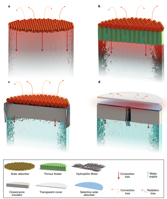 图4 |用于太阳能驱动界面蒸发系统的渐进式隔热设计。a、单层浮式蒸发结构。b、双层蒸发结构,由浮动多孔隔热体支撑。c,双层蒸发结构,由封闭孔隙热绝缘体支撑,抑制向下的热量损失。d,通过使用选择性太阳能吸收器和透明的气泡经纱盖,减少顶部太阳热表面的辐射和对流热损失。