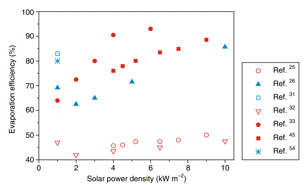 图5 |不同太阳能驱动界面蒸发系统的蒸发效率。不同太阳能驱动界面蒸发系统之间蒸发效率与太阳光照功率密度函数的比较。显示了利用等离子体基(红色符号)和碳基(蓝色符号)太阳能吸收器的界面蒸发系统的数据。空心和实心符号分别代表单层和双层蒸发结构。