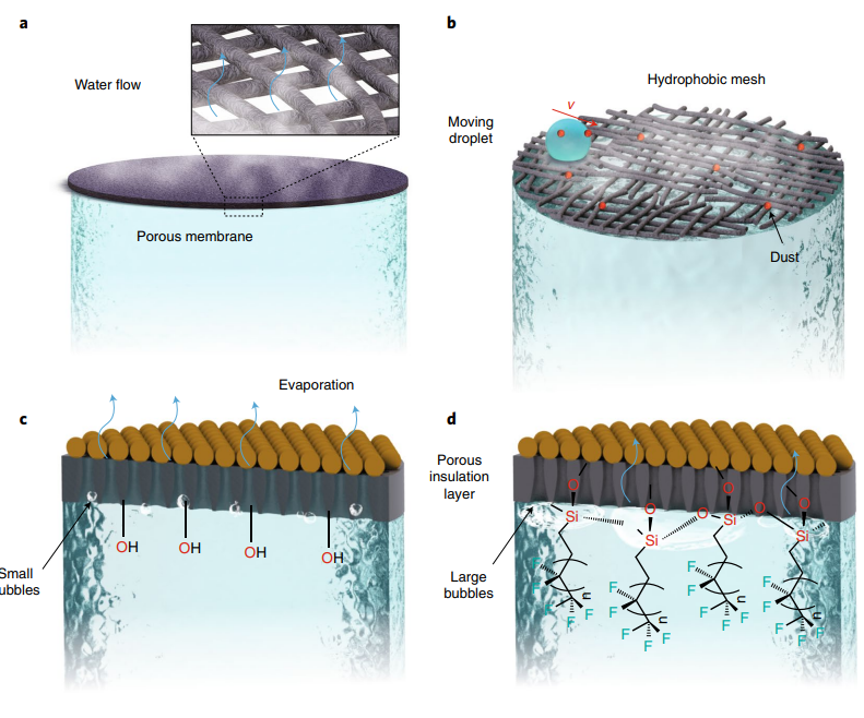 图3|太阳能驱动的界面蒸发结构。a,将太阳热加热集中在界面处的多孔浮动结构示意图。b,自清洁超疏水蒸发表面示意图。V是水滴在超疏水太阳能吸收器表面的移动速度。c,d,示意图显示表面润湿性对太阳能驱动界面蒸发性能的影响:亲水底层(c)和用氟硅烷表面改性的疏水性底层(d)