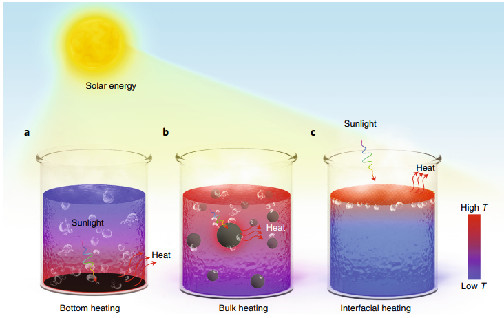 图1 通过各种形式的太阳能加热来驱动太阳能蒸发。a,基于底部加热的蒸发,其中太阳光被太阳能吸收器吸收并转化为热能以从底部加热大量液体。b,基于体积加热的蒸发,其中均匀分散的太阳能吸收器将入射太阳光子转化为热能以加热液体。c,基于界面加热的蒸发,其中太阳热转换和加热位于气液界面。T,温度。