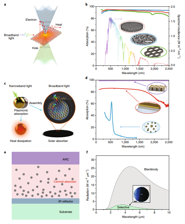 贵金属纳米颗粒的热稳定性是等离子体吸收剂所关注的一个问题,因为这些金属纳米颗粒在相对较高的温度下往往会失去其结构并熔合在一起。在组装的等离子体结构上涂覆氧化铝等陶瓷保护壳层已被证明能够稳定内部等离子体纳米粒子并提高其热稳定性。新型等离子体吸收体作为一类新型光热转换材料, 人们已经开发出诸如过渡金属氮化物等具有宽光吸收带宽、低成本以及最重要的是高温耐久性的材料来满足太阳能热应用的需求。