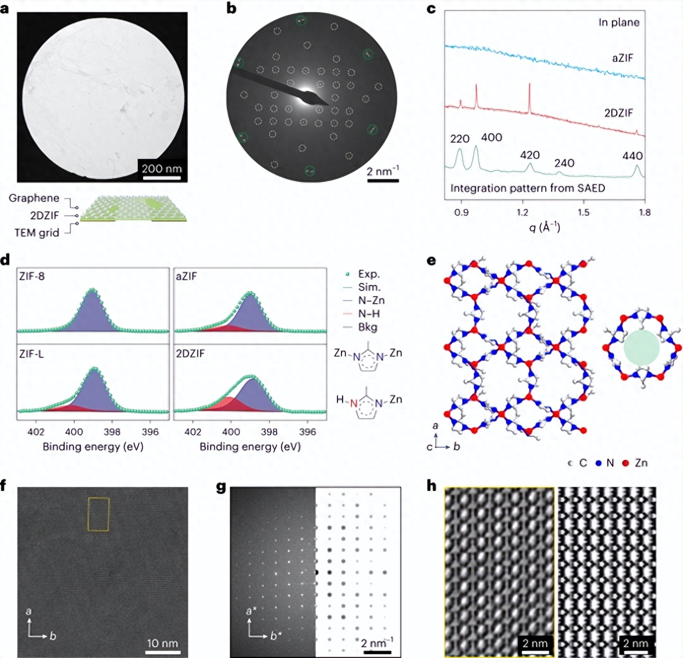 微米大小区域的选区电子衍射(SAED),产生了三组衍射图案(图2b)前两组(绿圈)具有六重对称性,源于两个取向稍差(3.0°)的石墨烯晶粒,而最后一组(白圈)具有两重对称性,归属于ZIF的单个晶粒,这证实了在石墨烯上制备的ZIF(称为2DZIF)是结晶的,晶粒大小至少为1 μm,与亚单层膜中晶粒的AFM成像一致。对Si/SiO2晶片上石墨烯上10 nm厚的ZIF膜进行了同步加速器掠入射X射线衍射(GIXRD)。GIXRD图显示出尖锐的衍射峰,与SAED图的径向积分获得的峰位置一致(图2c),证实在石墨衬底上形成的膜显示出结晶有序。如GIXRD和SAED数据所示,在单晶蓝宝石(Al2O3)、单晶石英(SiO2)和多晶Au膜上实现了择优取向的2DZIF膜。相反,在非晶衬底(Si/SiO2晶片)上制备ZIF薄膜是非晶的。2DZIF中的层由交替的4元环(MR)和6-MR链组成,而末端2-mIm连接体存在于层的两侧(图2e和3c)。2DZIF的孔径由6-MR组成(图2e),对气体分离很有吸引力。