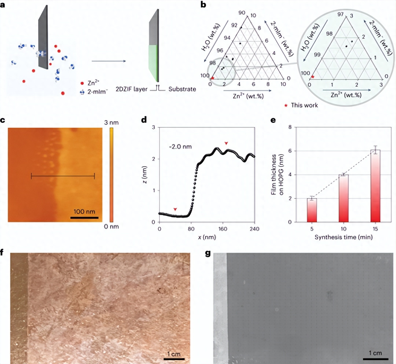 在HOPG上使用1 mM Zn2+和8 mM 2-mM的生长溶液反应5 min,制备ZIF膜,进行光学和SEM研究。在空气/前体溶液界面观察到对比度的急剧变化,薄膜具有均匀的对比度,表明薄膜是光滑、连续和宏观均匀。界面附近的AFM图证实,ZIF膜确实是连续的,厚度约为2 nm(图1c,d)。当合成时间减少到2 min,观察到具有微米大小的亚单层膜。磁畴为刻面状,厚度为2 nm,与连续膜的厚度一致,表明该膜是由微米大小的晶粒组成的晶体。将生长时间增长至10和15 min,可以获得4和6 nm厚的薄膜(图1e)。进一步将生长时间增加至20 min没有导致较厚的膜,表明前驱体耗尽。薄膜厚度与可能层数的拟合,产生了2 nm的单层厚度。在铜箔上通过化学气相沉积(CVD)衍生的石墨烯膜上,可以获得跨度几厘米的宏观大的ZIF膜(图1f,g)。