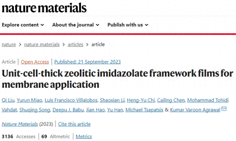 相关研究工作以“Unit-cell-thick zeolitic imidazolate framework films for membrane application”为题发表在国际顶级期刊《Nature Materials》上。