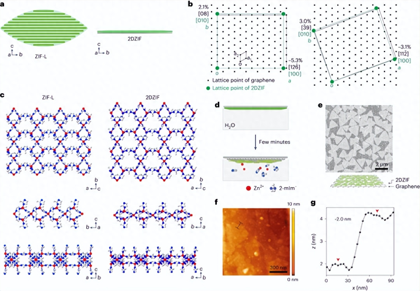 图3a显示了ZIF-L和2DZIF的形态差异。ZIF-L和2DZIF中的层沿c轴堆叠,但ZIF-L为叶状层状晶体,而2DZIF为宏观均匀的单层膜。尽管ZIF-L和2DZIF都具有正交晶格,但通过DFT弛豫获得2DZIF的晶胞参数与ZIF-L不同,与ZIF-L(19.719 Å)相比,2DZIF沿b轴具有明显更短的参数(17.060 Å)(图3c)。通过对2DZIF薄膜进行部分刻蚀,可以观察到2DZIF的晶粒(图3d)。部分溶解后,晶粒形状为三角形,横向尺寸为1-2 µm(图3e)。三角形晶粒的三面可以分别归属于(110)、(11(—)0)和(100)晶格平面,据报道是ZIF层的最小表面能平面。AFM图(图3f,g)证实晶粒具有均匀的厚度,约为2 nm,与2DZIF的结构一致。