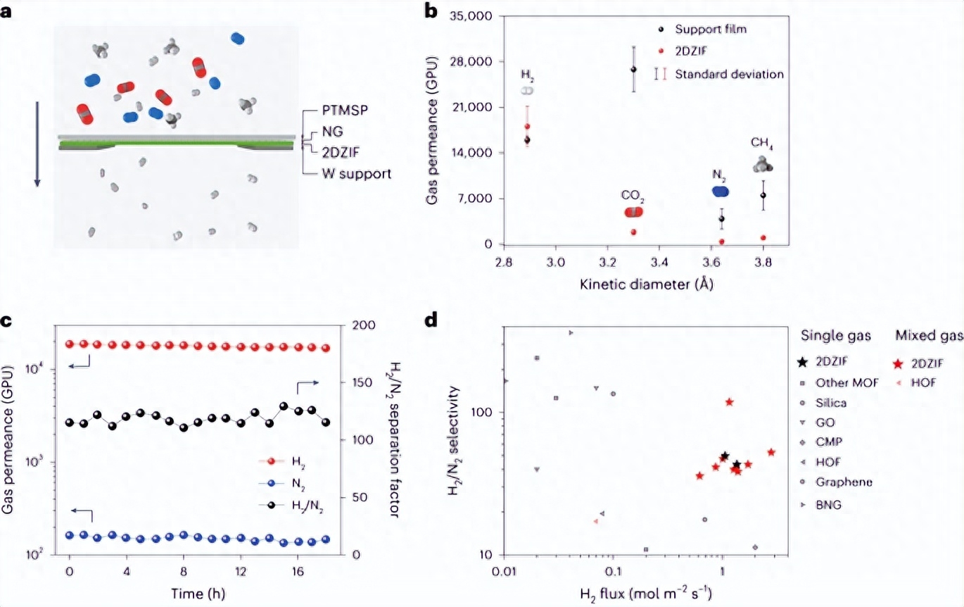 为了探讨H2在2DZIF薄膜上的筛分性能。在纳米多孔石墨烯(NG)上生长2DZIF膜,用致密250nm厚的聚[1-(三甲基甲硅烷基)丙炔](PTMSP)膜进行机械增强,其中NG/PTMSP膜充当支撑膜(图4a)。NG中的孔隙被有意设计较大(1.8±1.2 nm),以排除NG的任何分子筛选并测定2DZIF膜的H2筛分。大孔金属箔载体上的2DZIF膜(孔径5 µm,区域1 mm2),对于大于H2的分子表现出分子截止,表明气体传输由2DZIF的6-MR控制(图4b)。当以进料压力2 bar、H2渗透率17300 GPU探测等摩尔H2:N2混合物时,可获得H2/N2分离因子为115(图4c)。在高压进料(8 bar)测试另一种薄膜,表现出2.8 mol m−2 s−1的高H2通量和H2/N2分离因子为52。由于2DZIF薄膜在石墨烯上的高度均匀沉积,也可以制备更大面积(厘米级)的2DZIF膜(图1f,g)。它们还显示出有吸引力的H2渗透选择性分离性能,与较小面积的膜一致。