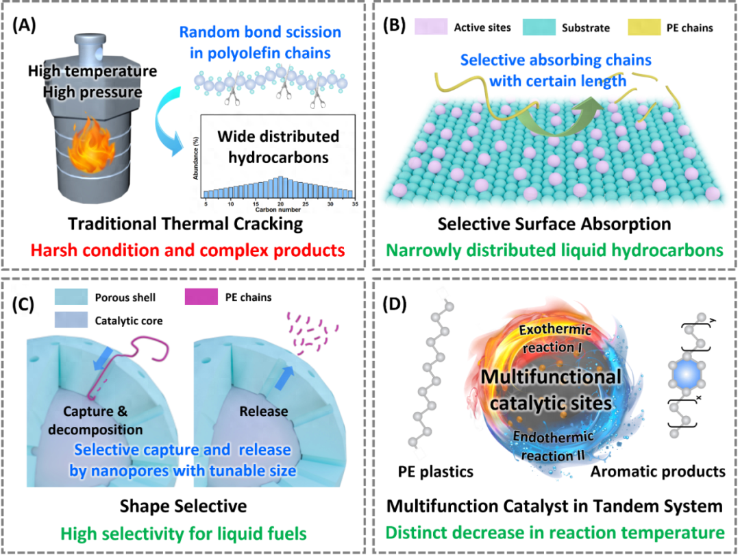图2 聚烯烃类塑料的热催化回收。(A)传统热催化需要高温、高压等苛刻条件且碳碳键随机断裂导致生成复杂的三相产物;(B) Pt/SrTiO3催化剂对聚乙烯分子链的选择性化学吸附实现升级回收制备燃油烃类;(C)酶启发mSiO2/Pt/SiO2催化剂中介孔限域热解聚乙烯塑料优化产物分布;(D)串联系统中双功能催化剂的热力学互补性降低总反应能耗。