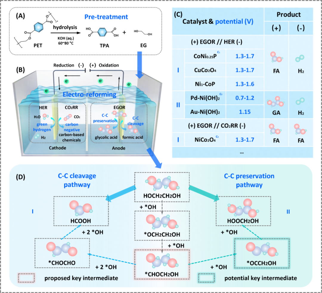 图4 电化学重整技术助力聚酯升级回收。(A)PET水解得到TPA和EG。(B)电催化重整系统的构造和阳极、阴极的反应。(C) PET电催化重整的代表性研究以及相应的反应路径、电位和产物。(D)EGOR中的两种转化模式:I,C-C键裂解路径;II,C-C保存途径。