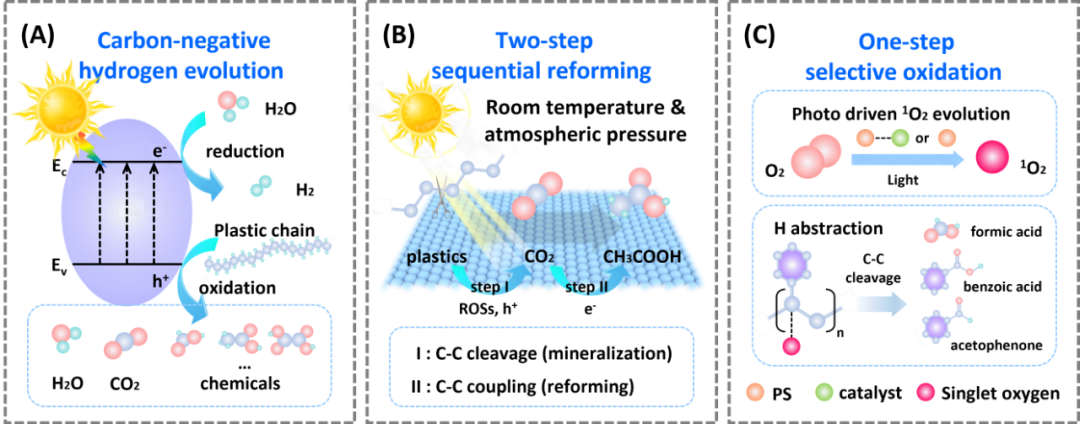 图3 废弃塑料的光催化回收技术。(A)塑料介导的负碳制氢技术;(B)两步串联矿化-重整技术。(C)单线态氧引发的一步选择性降解技术。