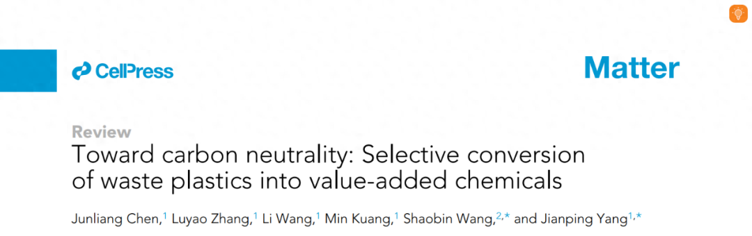 Junliang Chen, Shaobin Wang*, Jianping Yang* et al. Toward carbon neutrality: Selective conversion of waste plastics into value-added chemicals. Matter 2023, 6, 3322–3347.