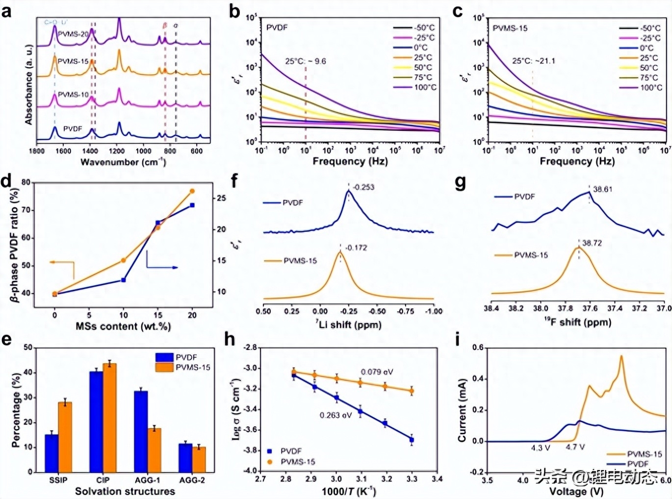 【图2】电解质的溶剂化结构分析和电化学性能。电解质的FTIR 光谱。PVDF ( b ) 和 PVMS-15 ( c ) 电解质在不同温度下相对介电常数的实部( εr' ) 作为频率的函数。d MSs含量与β -PVDF比例和εr'之间的关系。e PVDF 和 PVMS-15电解质的拉曼光谱结果。值是平均值,误差线是通过从三个相同样品的测量中取标准误差来计算的。f7Li NMR 谱。g19F NMR谱。H PVMS-15 和 PVDF电解质的离子电导率的阿伦尼乌斯图。值是平均值,误差线是通过从三个相同样品的测量中取标准误差来计算的。i PVMS-15 和 PVDF电解质的 LSV曲线。