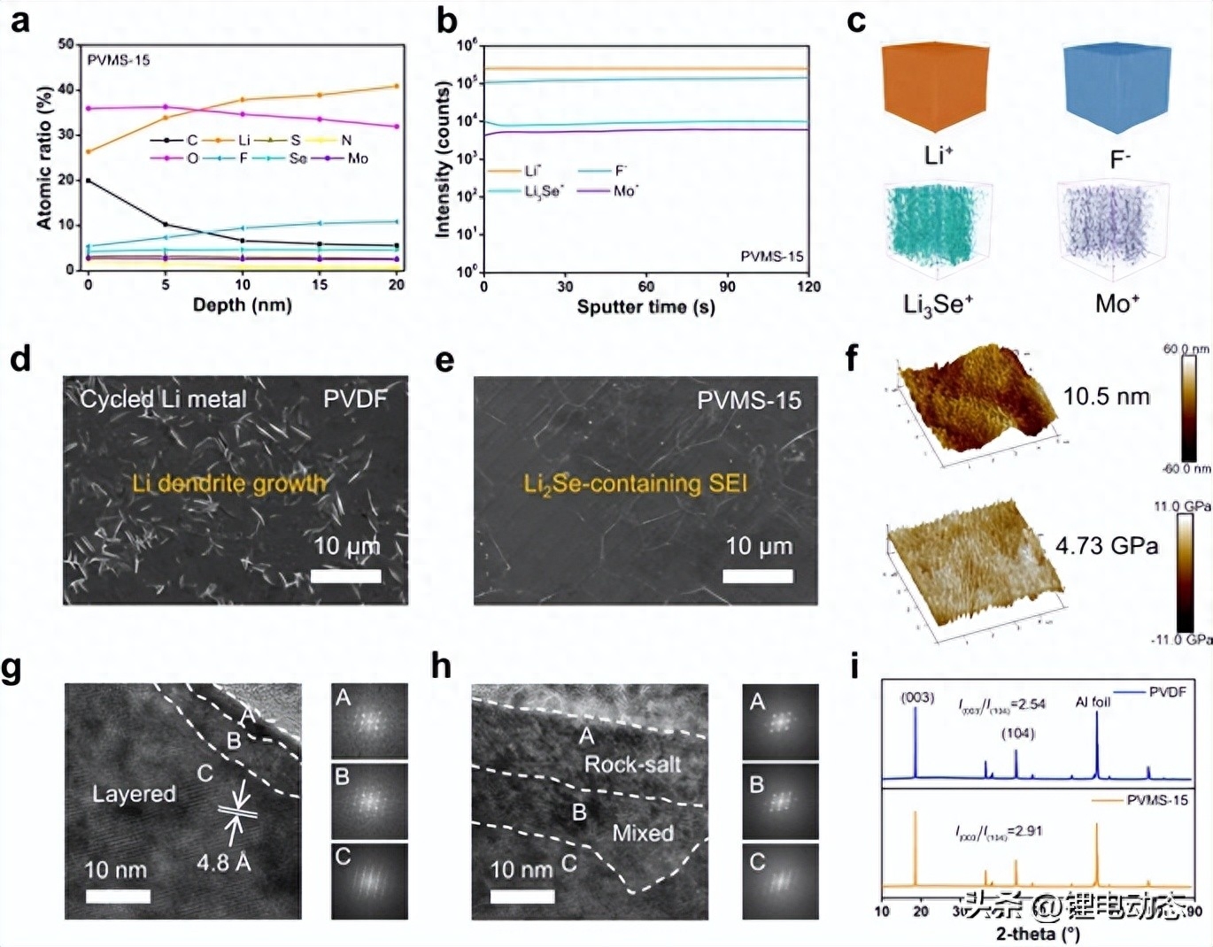 【图5】循环电极的界面和结构分析。a使用 PVMS-15电解质在不同溅射时间下SEI 的原子比。b由PVMS-15 电解质形成的SEI 中二次离子碎片的TOF-SIMS 深度剖面和3D 视图( c )。使用PVDF ( d ) 和PVMS-15 ( e )电解质循环锂金属的表面SEM 图像。f使用PVMS-15电解质时循环锂金属的粗糙度和杨氏模量测试的3D AFM 图像。使用PVDF ( g ) 和PVMS-15 ( h )电解质时循环NCM811 的纳米结构。i循环NCM811 正极的XRD 谱。