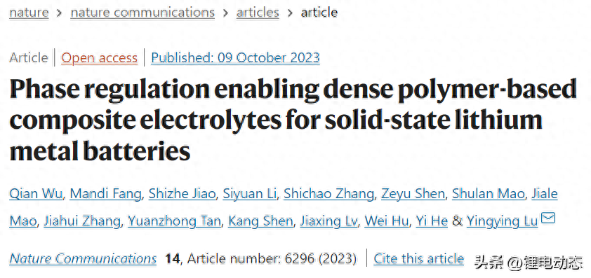 近日,浙江大学的陆盈盈教授等人提出了一种相调节策略,以破坏聚偏二氟乙烯链的对称性,并通过掺入MoSe2片来获得致密的复合电解质。高介电常数电解质可以优化溶剂化结构,实现高离子电导率和低活化能。MoSe2之间的原位反应与Li金属在固体电解质界面生成Li2Se快导体,提高了库仑效率和界面动力学。固态Li||Li电池在1 mA cm-2下实现了稳健的循环,而Li|| LiNi0.8Co0.1Mn0.1O2在软包全电池中表现出高倍率(3C)、高负载(2.6 mAh cm−2)下实用性能。该研究以题目为“Phase regulation enabling dense polymer-based composite electrolytes for solid-state lithium metal batteries”的论文发表在国际顶级期刊《Nature Communications》。