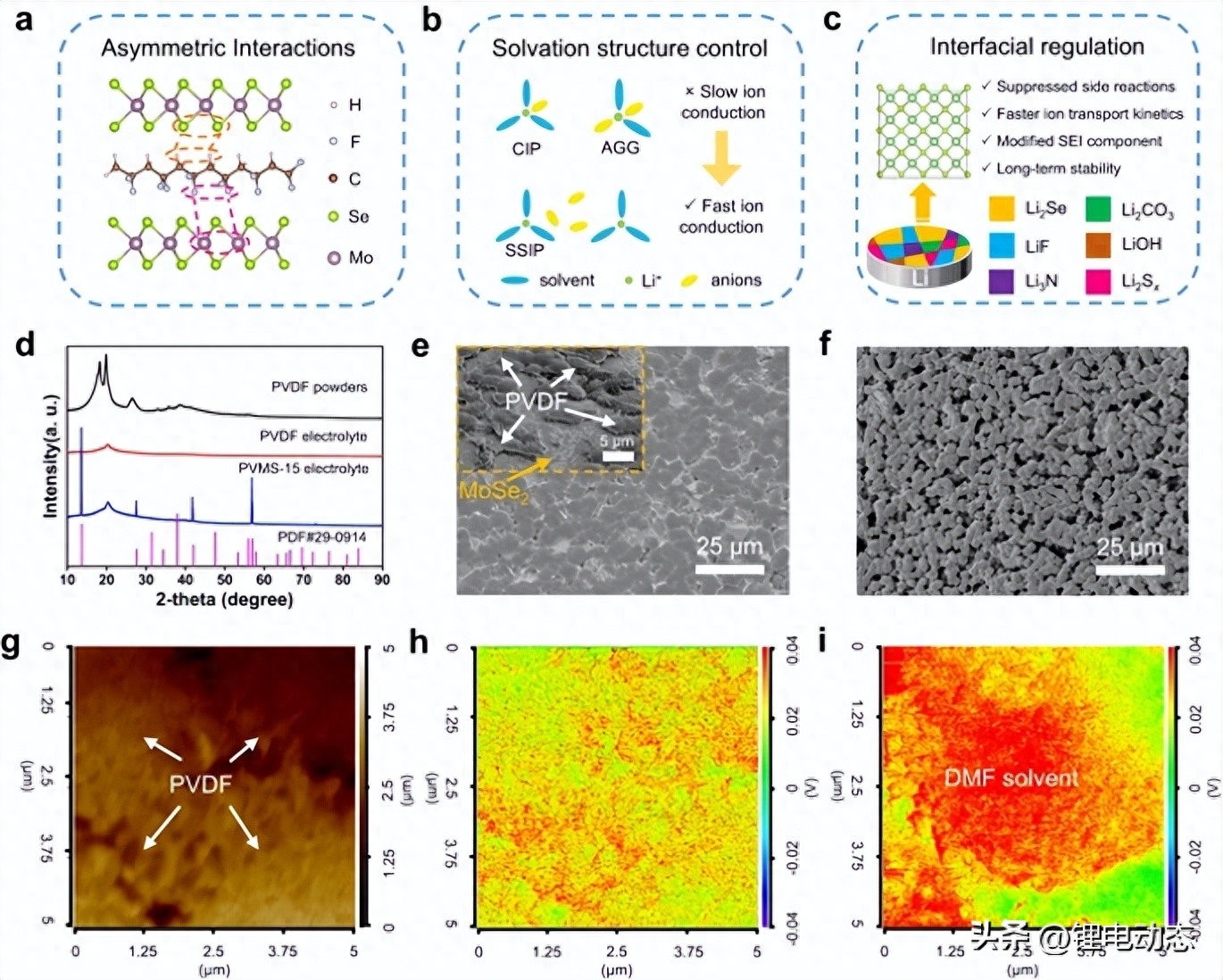 【图1】电解质的设计原理和结构特征。a不对称相互作用。b溶剂化结构控制。c界面调节。d PVDF粉末、PVDF和PVMS-15电解质的XRD图谱。e PVMS-15 电解质的表面SEM 图像。插图是从FIB-SEM 获得的PVMS-15 电解质的表面。f PVDF 电解质的表面SEM 图像。g PVMS-15 ( h ) 和PVDF ( i ) 电解质中DMF 溶剂的C = O 振动的AFM和纳米红外重叠。红色区域表示存在DMF溶剂,绿色区域表示不存在DMF溶剂。