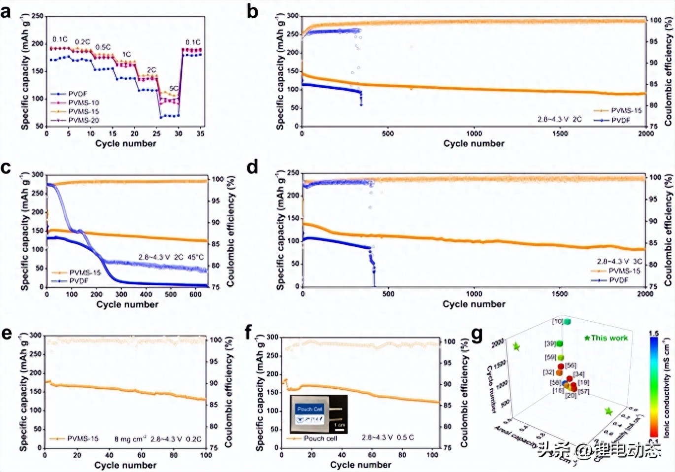 进一步评估了许多恶劣条件下的性能,包括高截止电压、宽温度范围和软包电池。如图4c所示 ,在45℃高温下,Li|PVMS-15|NCM811电池在660次循环后显示出85.7%的高容量保持率,而Li|PVDF|NCM811电池则出现快速容量衰减。100 次循环后,CE低得多,为81.3%,这可能是由于电解质严重分解所致。在4.5 V的较高截止电压下,Li|PVMS-15|NCM811仍可正常循环600次,容量保持率为77.8%,而Li|PVDF|NCM811电池在首次循环时可观察到过充现象(补充图38)。