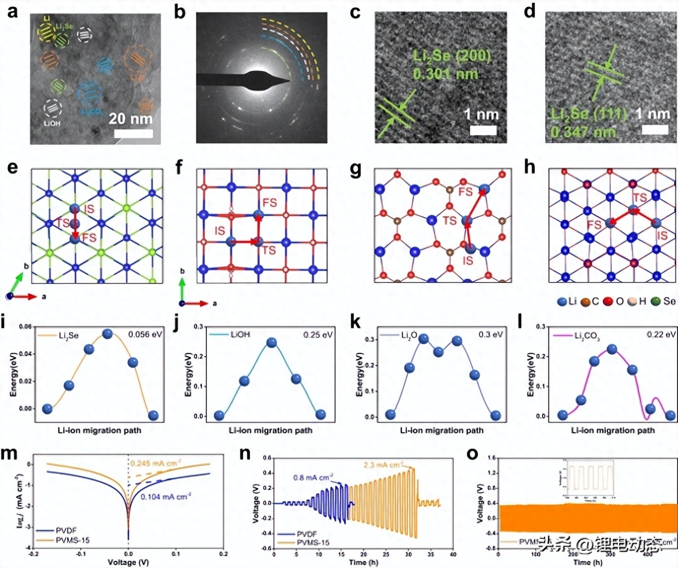 【图3】界面分析和表征。a由PVMS-15 电解质形成的SEI 的放大TEM 图像。b FFT 模式。c Li2Se (200)的 HRTEM图像。d Li2Se (111)的 HRTEM图像。( e , i ) Li2Se、( f , j )LiOH、( g , k ) Li2O和( h , l ) Li2CO3的离子扩散路径和势垒。m ECD 测试。n CCD测试。O使用PVMS-15电解质的Li||Li电池在电流密度为1 mA cm-2下的恒电流循环曲线。