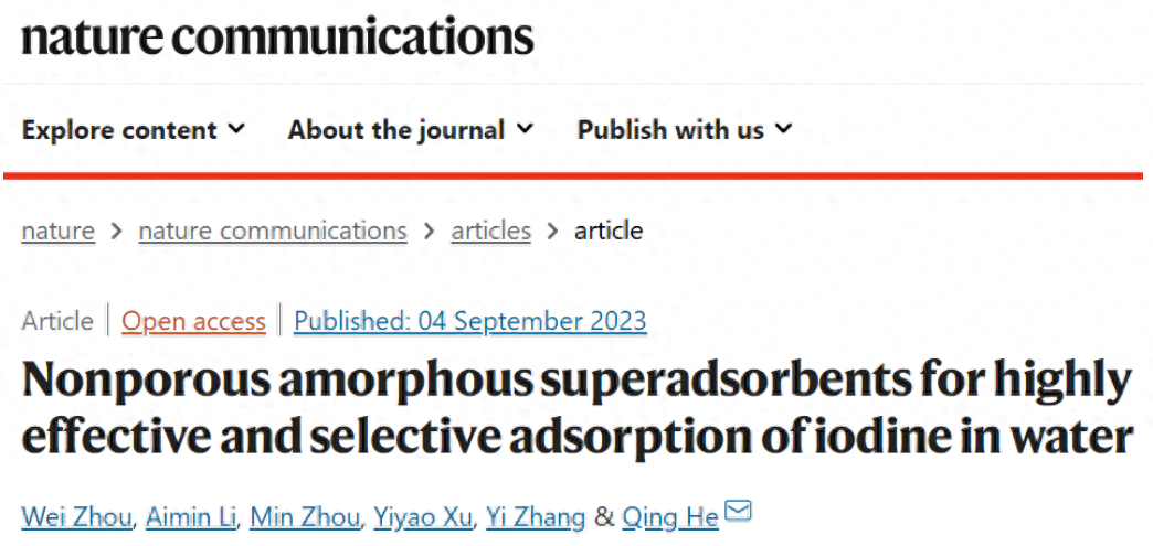 1.Zhou, W., Li, A., Zhou, M.et al. Nonporous amorphous superadsorbents for highly effective and selective adsorption of iodine in water. Nat Commun 14, 5388 (2023). https://doi.org/10.1038/s41467-023-41056-5