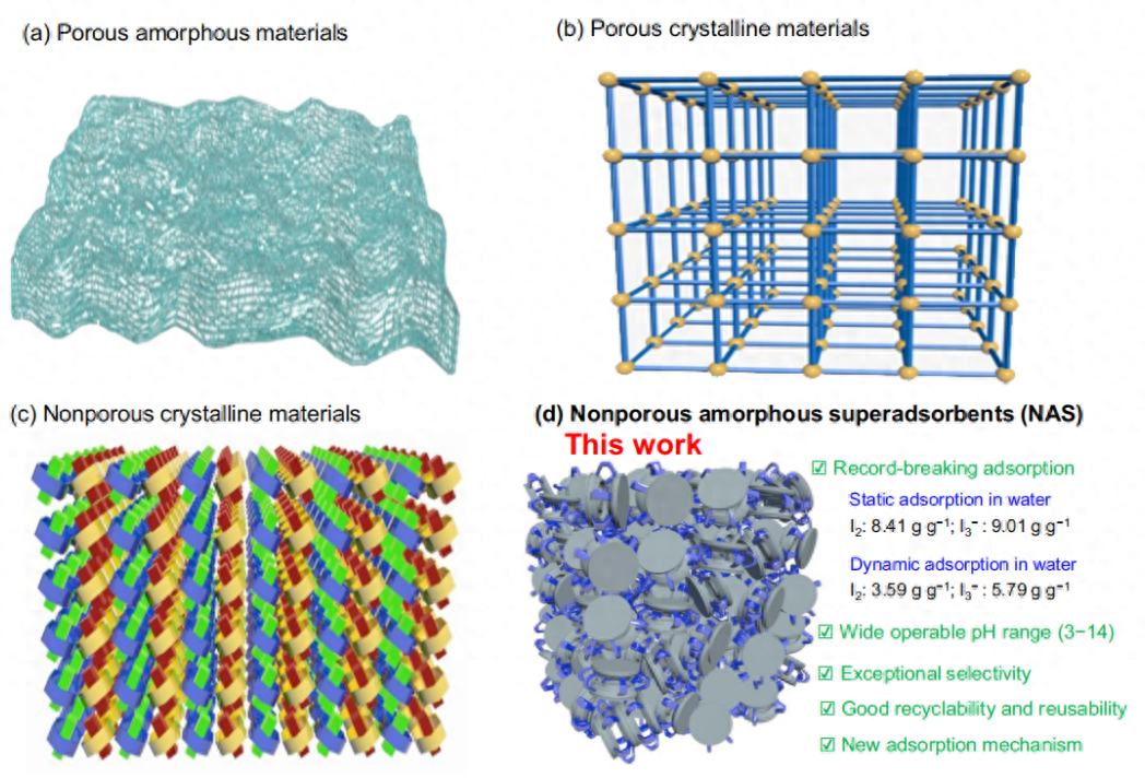 最终,相关论文以《高效选择性吸附水中碘的非多孔非晶态超级吸附剂》(Nonporous amorphous superadsorbents for highly effective and selective adsorption of iodine in water)为题发在 Nature Communications[1],博士生周维是第一作者,何清担任独立通讯作者。