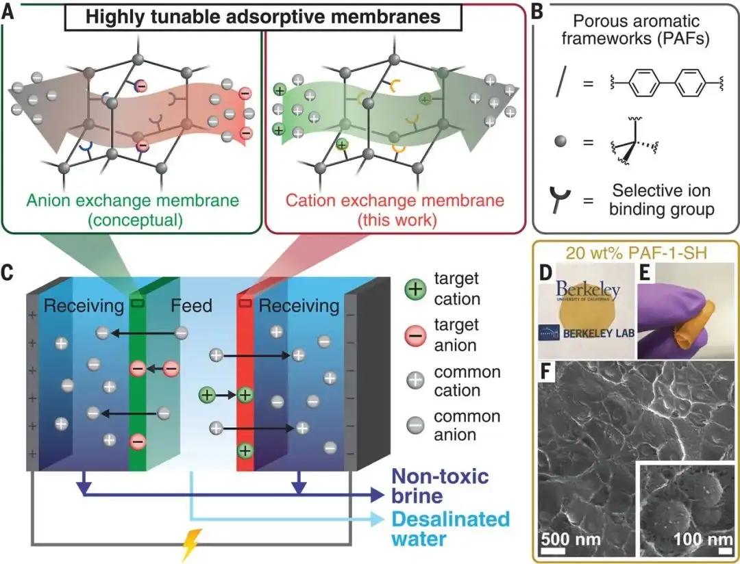 图1. 海水淡化技术的相关流程目前,海水淡化领域的主流技术是反渗透膜技术。其中,反渗透膜的孔径达到纳米级,在一定压力下,水分子可以通过而海水中的无机盐、重金属离子、有机物、胶体、细菌、病毒等杂质无法通过,从而实现海水的淡化。然而,该技术一直存在高成本、高能耗和膜二次污染等问题。此外,该过程通常会留下难以处理的有毒盐水,包含对植物有毒的硼以及对人类有害的重金属,如砷和汞。因此,急需开发低成本,低能耗和高效率的水处理技术,同时能够去除水中含有的有害金属。为了解决海水淡化的这一技术难题,加州大学伯克利分校Jeffrey R. Long教授课题组在《Science》刊文报道了一种能够同时去除海水中的盐分及重金属的离子捕获电渗析技术(ion-capture electrodialysis)。研究人员首先合成了掺杂多孔芳香骨架材料(PAFs)纳米粒子的聚合物离子交换膜,然后将其与电渗析脱盐工艺相结合。结果发现,该柔性聚合物膜在淡化海水的同时可以去除几乎100%的有毒金属(砷和汞),生产出纯净的盐水和纯净水,并捕获有价值的金属(如金)供后续使用或处理。此外,用不同的基团修饰PAFs分子上的苯环,就能特异性地捕获不同的物质,十分灵活。最重要的是,该海水淡化膜在水中和高温条件下都具有良好的稳定性,并且可以重复使用,为高效制备饮用水提供了新思路。研究成果以“Ion-capture electrodialysis using multifunctional adsorptive membranes”为题,于4月16日发表在《Science》上!