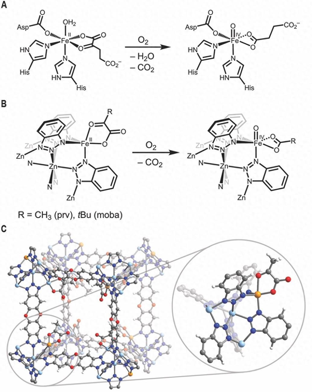 近年来,MOF被视为一种适用于仿生化学研究的材料。由于具有多孔和结构可调的性质,MOF材料还适合用来探索固体-气体反应中的反应机理。将金属中心固定在晶格中,这有助于防止高自旋四价铁氧中间体通过二聚化或分子内配体氧化而分解。于在此背景下,Fe1.5Zn3.5Cl4(btdd)3(H2btdd = bis(1H-1, 2, 3-triazolo[4, 5-b], [4', 5'-i])dibenzo[1,4]dioxin)作为潜在的仿生材料脱颖而出。MOF材料FexZn5-x(prv)4(btdd)3(x = 1 or 1.8; Hprv = 丙酮酸)和FeZn4(moba)4(btdd)3(Hmoba = 3,3-二甲基-2-羟基丁酸)可与氧气反应生成高自旋(S = 2)的Fe(IV)=O化合物,并可以氧化碳氢化合物(图1B和1C)。
