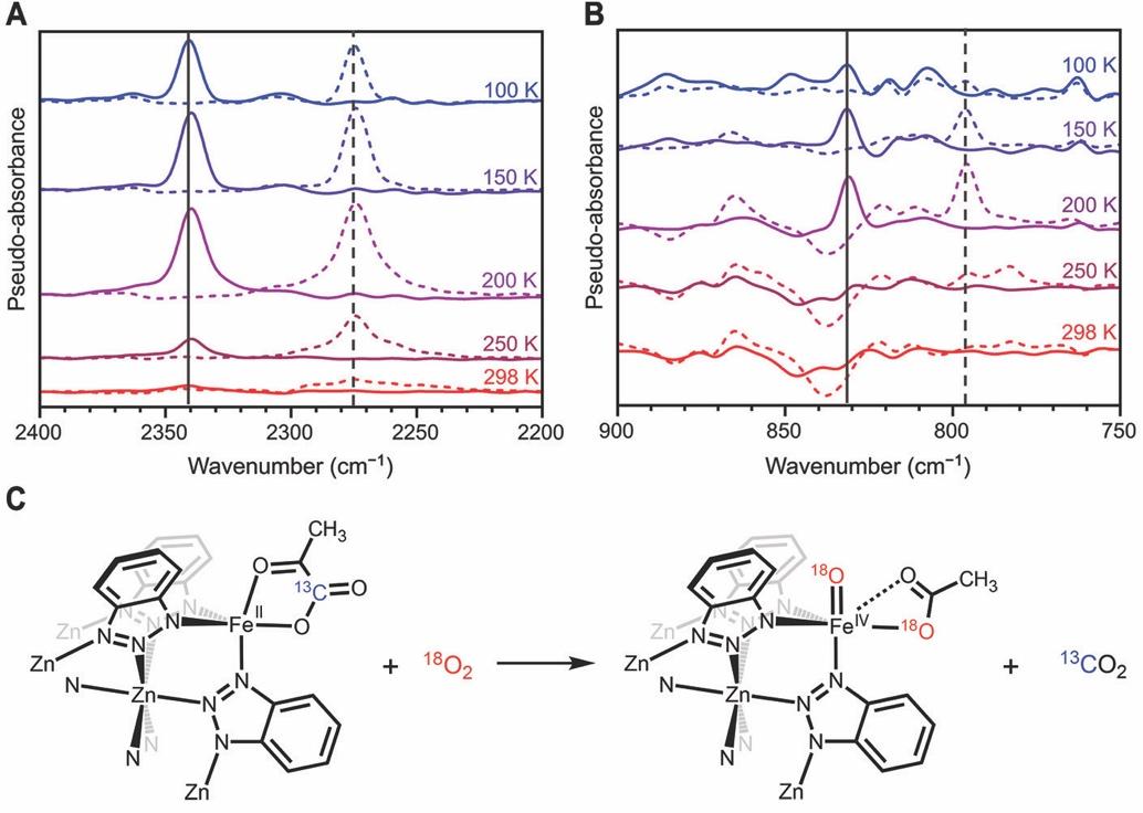 在自然界中,非血红素铁酶使用氧气生成高自旋四价铁氧物种,用于各种氧化反应。几十年来,尽管合成化学家进行了很多尝试,但是在人造系统中模拟这一过程——像酶一样活化氧气生成高自旋四价铁氧物种——仍是一个尚未实现的目标。加州大学伯克利分校化学系的Jeffrey R. Long教授领导的团队报道了一种新型的金属-有机框架(MOF)材料,其中含有的二价铁位点局部结构与α-酮戊二酸依赖性双加氧酶(ɑ-ketoglutarate-dependent dioxygenases)的活性中心类似。该材料在低温(低至100 K)下可以与氧气直接反应,生成高自旋四价铁氧物种。作者通过多种谱学方法对该铁氧物种进行了表征,包括原位漫反射红外光谱(in situ diffuse reflectance Fourier transform, DRIFTS)、原位和可变场穆斯堡尔谱(Mossbauer spectroscopy)、Fe Kβ X射线发射光谱(X-ray emission spectroscopy, XES)和核共振振动光谱(Nuclear resonance vibrational spectroscopy, NRVS)。实验结果表明,在氧气环境中,该MOF材料能够催化环己烷的氧化和乙烷到乙醇的化学计量转化。相关研究成果于2023年11月3日在线发表于《科学》(Science)杂志。