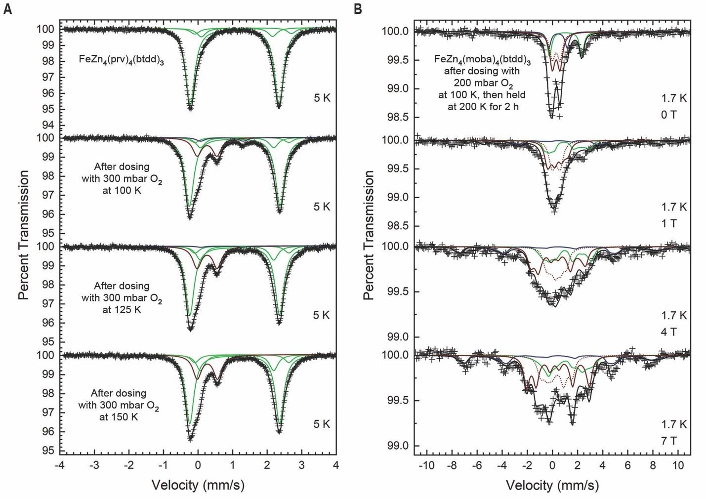 当在125 K和150 K下,向FeZn4(prv)4(btdd)3继续通入氧气,Fe(IV)=O双峰的面积百分比可以增加到最大的20.0(2)%。然而,在163 K通入氧气并未导致Fe(IV)=O双峰的百分比增加。在此温度下,有可能最初生成了更多的Fe(IV)=O物种,但其中一些位点与乙酸配体反应,生成一个羟基化产物并重新形成高自旋铁(II)位点。类似的分子内α-C–H键羟基化在α-酮戊二酸依赖型双氧酶中此前有过报道。最后,在没有额外通入氧气的情况下,在250 K和298 K加热样品后,收集了5 K下的光谱。在250 K加热后,Fe(IV)=O双峰的面积只有9.7(3)%;在298 K加热后,Fe(IV)=O双峰消失,这与DRIFTS数据中观察到的分解现象一致。
