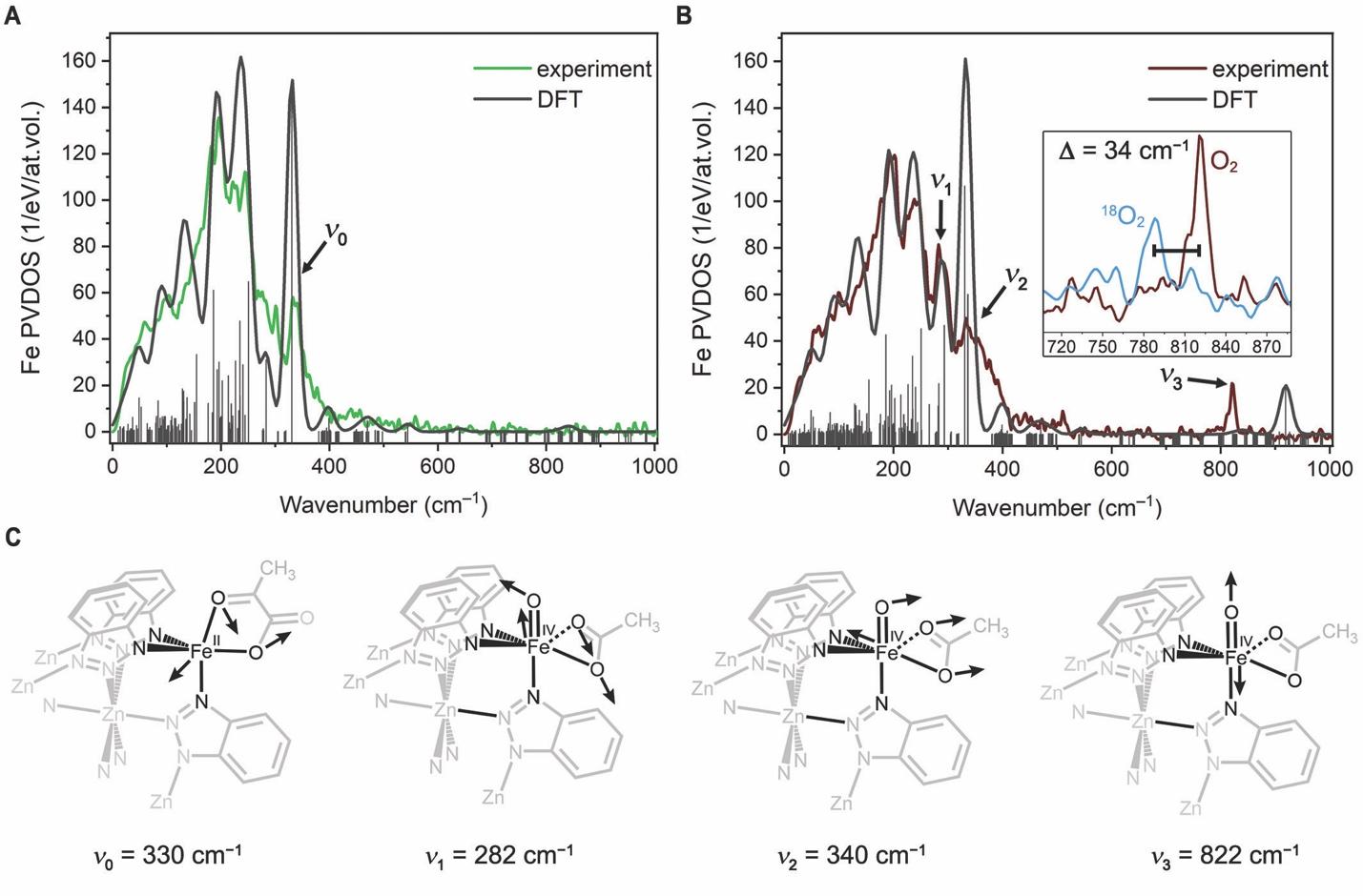 图4. 高自旋四价铁氧物种核共振振动光谱分析。图片来源:Science