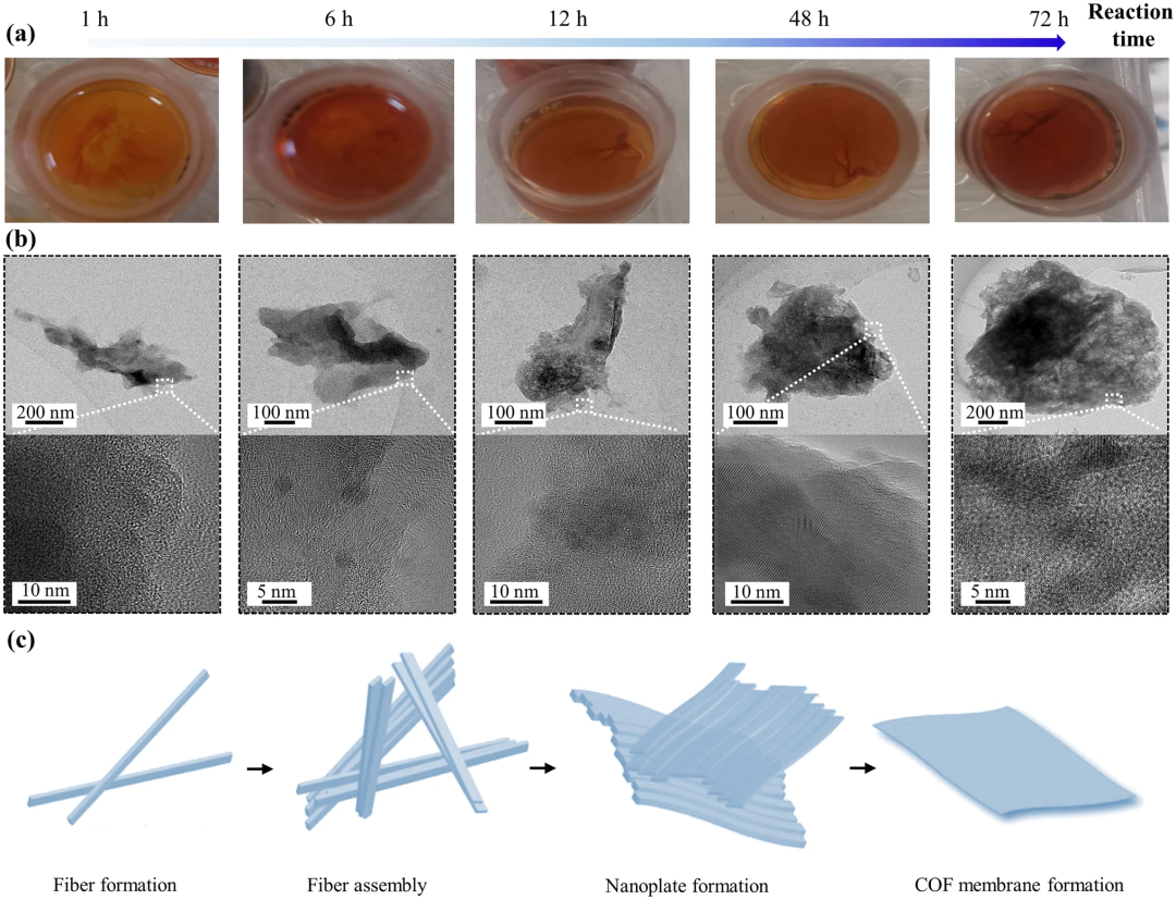 图2. COF膜形成机理。(a-c)不同时间下COF膜的光学照片、TEM图和结构转化示意图。