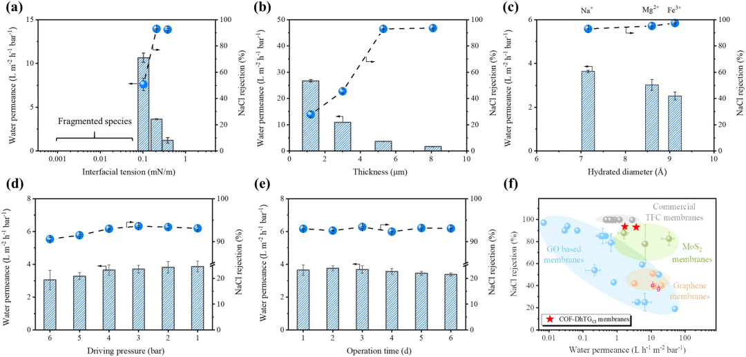 图5. (a-e) 不同界面张力、膜厚度、原料浓度、操作压力及运行时间条件下COF-DhTGc˪膜的纳滤脱盐(NaCl)性能;(f) 本文中COF膜与文献报道的脱盐膜性能比较。