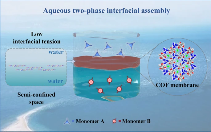 1. 首次提出了双水相法,并尝试用于COF膜制备,实现了非有机溶剂体系组装膜的突破。