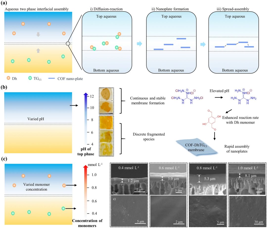 图3. COF-DhTGc˪膜的结构演变。(a) 界面组装机理示意图;(b) 不同pH下膜结构演变示意图;(c) 不同单体浓度下膜形貌。