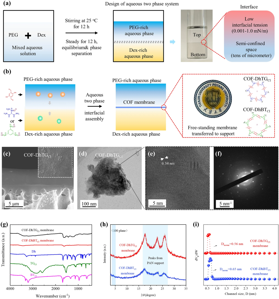 图1. COF膜的制备与形貌表征。(a) ATPS的设计过程示意图;(b) 双水相界面组装COF膜过程示意图;(c-f)COF-DhTGc˪膜的SEM图、HR-TEM图和SAED图;(h-i)两种COF膜的GIXAXS谱图和孔尺寸分布图。
